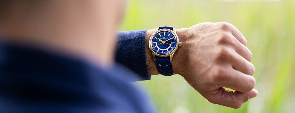 Limited to 300 pieces, this new Freedom 60 GMT is delivered in a case crafted from bronze and features a timeless midnight blue dial with the GMT scale on a black and white centre ring. It is presented on a vegan-certified Perlon rubber strap in a striking shade of blue.