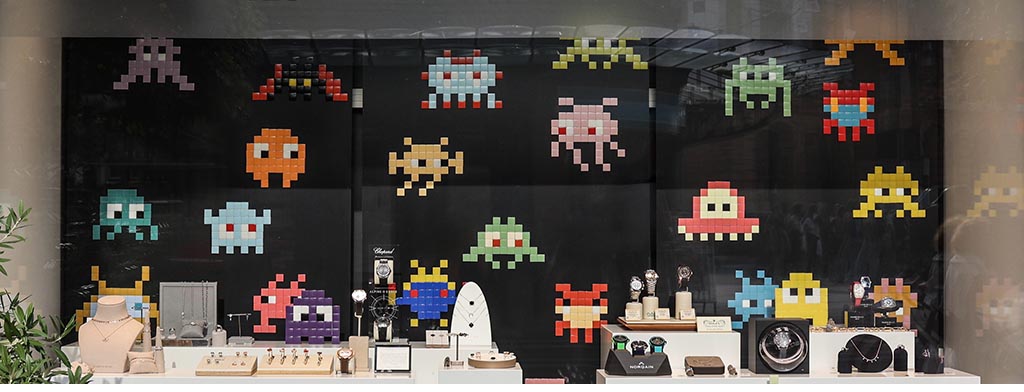 Step into a retro-gaming vibe with window displays fully decked out in the spirit of classic arcade games and pixel art! Inspired by the 8-bit universe of Pac-Man and early consoles, this colorful, playful setup features tiny, pixelated characters, bursting with color and mischief, as if they just popped out of an old-school screen.
