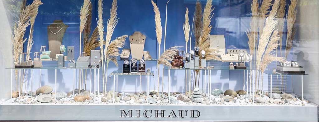 C’est avec de l’herbe de la pampa et des galets que la bijouterie Michaud a souhaité accueillir ce beau mois de mai. Les journées s’allongent, les températures deviennent plus agréables, le temps de l’évasion et des longues promenades au bord de l’eau est arrivé. Et si vous n’avez pas le temps d’y aller, passez devant nos vitrines de la place Pury... il paraît que l’on entend le vent souffler dans les roseaux…