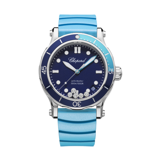 À la fois sportive et élégante, Happy Ocean est la montre idéale pour explorer les fonds marins, pour succomber aux joies du farniente sur le pont d'un voilier, ou pour danser sur le sable. Aussi technique que ludique, elle est étanche et bat au rythme d'un mouvement Chopard à remontage automatique. Little Diamonds Do Great Things