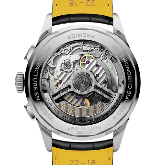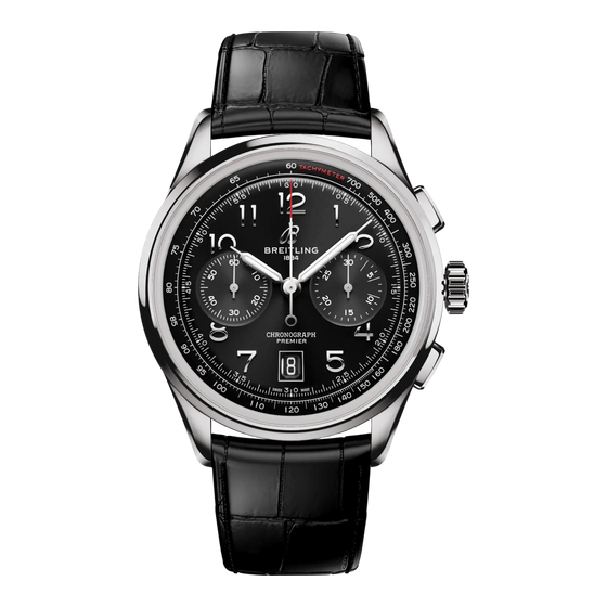 Mouvement Calibre: Breitling 01 (Manufacture) Mouvement: Mécanique, remontage automatique Réserve de marche: Env. 70 heures Chronographe: 1/4 seconde, 30 minutes Vibration: 28 800 a/h Rubis: 41 rubis Calendrier: A guichet