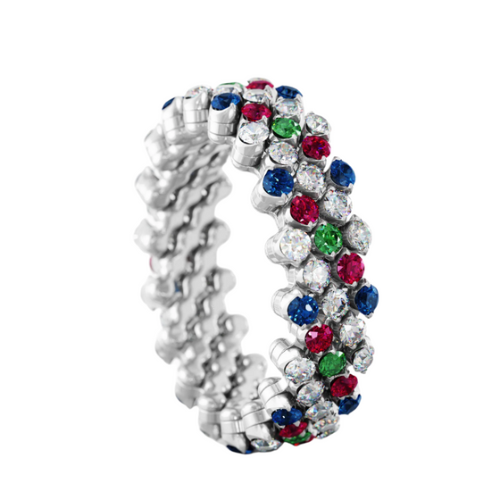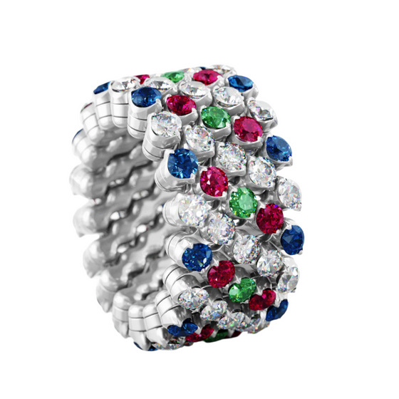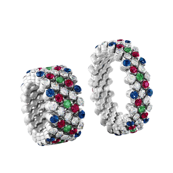 La collection Special Match exploite des combinaisons de couleurs de pierres spéciales pour créer des solutions originales à fort impact créatif. Dans ce bijou, les pierres sont disposées dans une séquence alternant des rangées de diamants blancs avec des rangées de pierres de couleur dans un ordre précis.