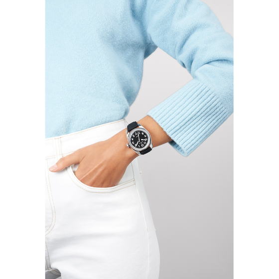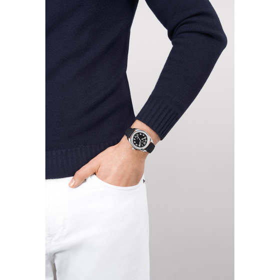 The template for the new generation of ZENITH PILOT watches, the PILOT Automatic watch is crafted in a 40mm steel case with an oversized crown, paired with a black corrugated dial featuring large luminescent Arabic numerals. Delivered with interchangeable black cordura-effect rubber and brown calfskin leather straps. Powered by the El Primero 3620 automatic high-frequency manufacture movement.