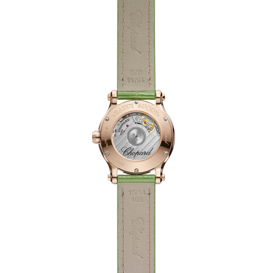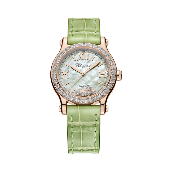 The Happy Sport women's diamond watch collection is the emblem of Chopard’s creativity and boldness. Dancing between two sapphire crystals, the playful, free-spinning gems of this green mother-of-pearl and diamond watch have captured the imagination since 1993, when Chopard became the first Maison to combine steel and diamonds. Its watchmaking expertise has enabled Chopard to equip the Happy Sport 30 mm green mother-of-pearl and diamond watch with a mechanical movement with automatic winding specially developed for feminine cases. Little Diamonds Do Great Things.