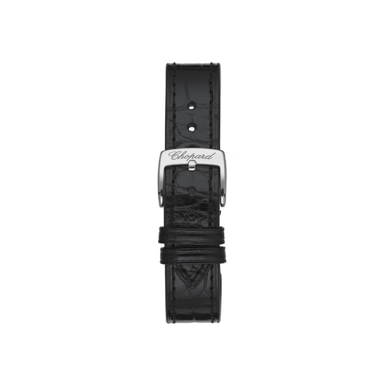 Movement Movement: CHOPARD 09.01-C Type of winding: self-winding mechanical movement Function: hours and minutes, seconds Power reserve: Power Reserve of approximately 42 hours Frequency: 3.5 Hz (25,200 vibrations per hour) Decoration on movement: bridges adorned with Côtes de Genève, circular-grained mainplate Balance spring: flat Balance wheel: with three spokes Movement thickness: 3.65 Number of movement parts: 149 Jewels: 27
