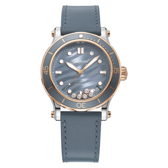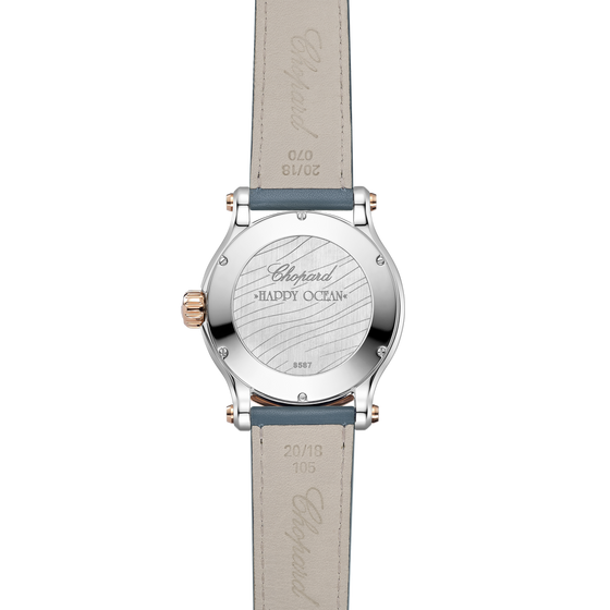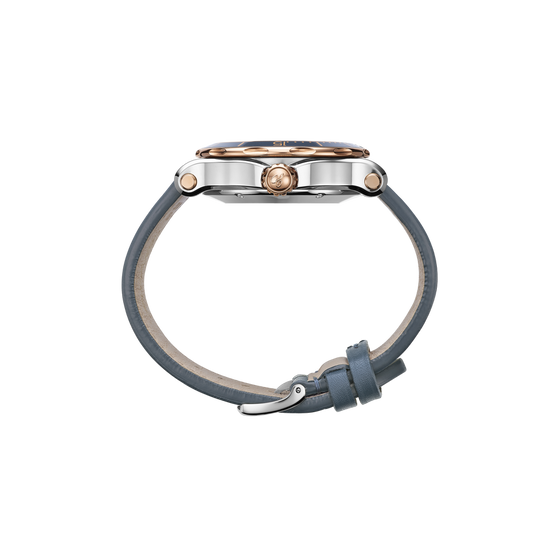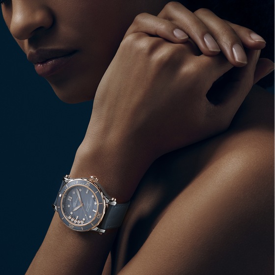 Case & Dial Metal: 18-carat rose gold and stainless steel Thickness: 14.21 mm Dial: Blue-grey dial with wave decoration Water-resistant: 300 metres Crown material: 18-carat ethical rose gold Crown type: screw-down Case-back: Front Glass