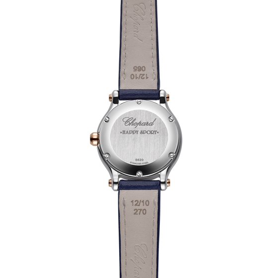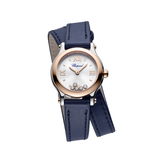 The Happy Sport women's floating diamond watch collection is the emblem of Chopard’s creativity and boldness. Dancing between two sapphire crystals, the playful, free-spinning precious stones of this rose gold and Lucent Steel™ watch have captured the imagination since 1993, when Chopard became the first Maison to combine steel and diamonds. Little Diamonds Do Great Things.
