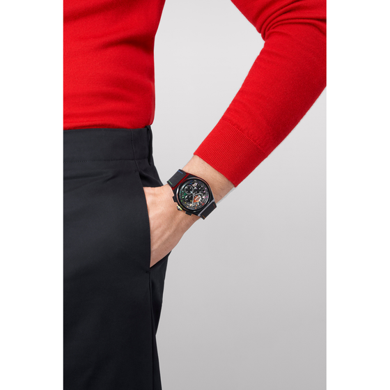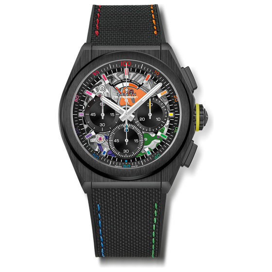 The DEFY 21 Chroma II is a colourful execution of the high-frequency El Primero 21 1/100th of a second chronograph model, crafted in a 44mm black ceramic case with rainbow-coloured movement visible through the open dial set with markers in a gradient of tones. The black rubber strap also features rainbow stitching.