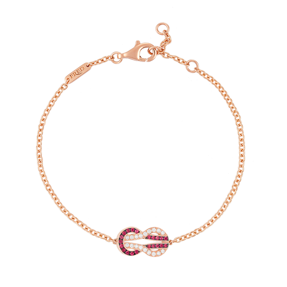 - 18k pink gold - Chain length: 17cm. - Adjustable rings at 15 cm et 16 cm. - Pattern length: 14 mm. - Pattern width: 8 mm. - 18 brilliant cut white diamonds: 0.07 carat*/GVS. - 21 rubies: 0.09 carat*. *The weight of the stones is an average value given for information only.
