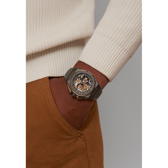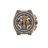 Case Material: Microblasted Titanium & Rose Gold Diameter: 45.00 Water resistance: 20 ATM Dial: Tinted sapphire with three black-coloured counters