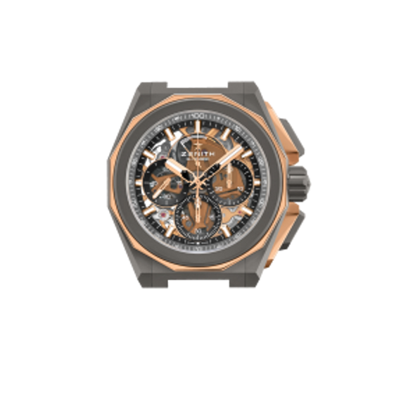 The DEFY Extreme 1/100th of a second chronograph is made in light yet robust titanium with an entirely matte finish with rose gold elements. The tinted sapphire dial reveals the El Primero 21 automatic chronograph movement with two escapements. The DEFY Extreme watch comes with a titanium strap as well as a rubber strap and a Velcro strap.