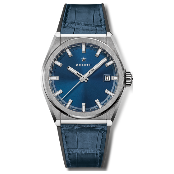 A pure expression of the retro-futuristic DEFY Classic with a blue sunray-patterned dial and blue leather strap, powered by the Elite automatic calibre.