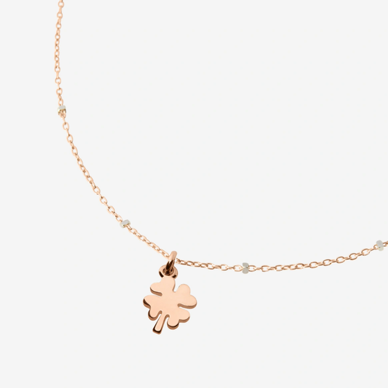 Necklace in 9K rose gold and 9K rhodium plated white gold with mini four leaf clover charm in 9K rose gold and plaquette in 9K rose gold.