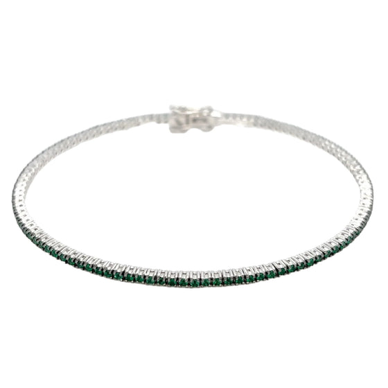 This white gold tennis bracelet, adorned with dazzeling emeralds, is a unique creation. This timeless classic piece of jewelry exudes a striking elegance, perfect for those seeking both luxury and bold sophistication.