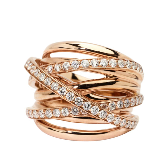 This rose gold ring, featuring a delicate multi rows design with white diamonds, is a unique creation. This exquisite piece of jewelry exudes a striking elegance, perfect for those seeking both luxury and bold sophistication.