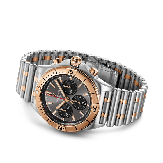 Breitling’s all-purpose watch for your every pursuit. The Chronomat holds a significant place in Breitling’s history. Introduced in 1984, at a time where extra-thin quartz timepieces were the order of the day, Breitling placed a bold bet on an impressively proportioned mechanical watch. Based on the Frecce Tricolori chronograph, which had been developed and launched in 1983 in collaboration with the famed Italian aerial squadron, the Chronomat celebrated Breitling’s centenary in style and marked the return of the mechanical chronograph to its rightfully prominent place at the brand which had built its global reputation on these incredible watches. Available in a variety of materials from stainless steel to luxurious 18 k red gold, the Chronomat features a 42 mm case and the iconic bezel with the four rider tabs. Available in a range of colorful dials, the Chronomat is matched to the signature “Rouleaux” bracelet in metal or rubber and is powered by the in-house Breitling Manufacture Caliber 01, a COSC-certified chronometer.