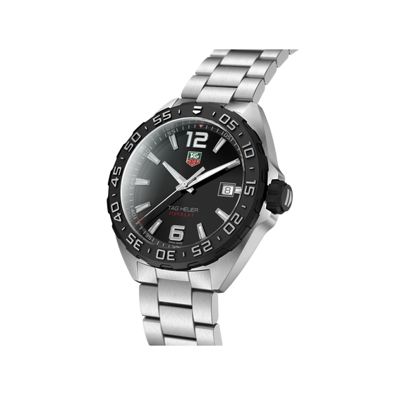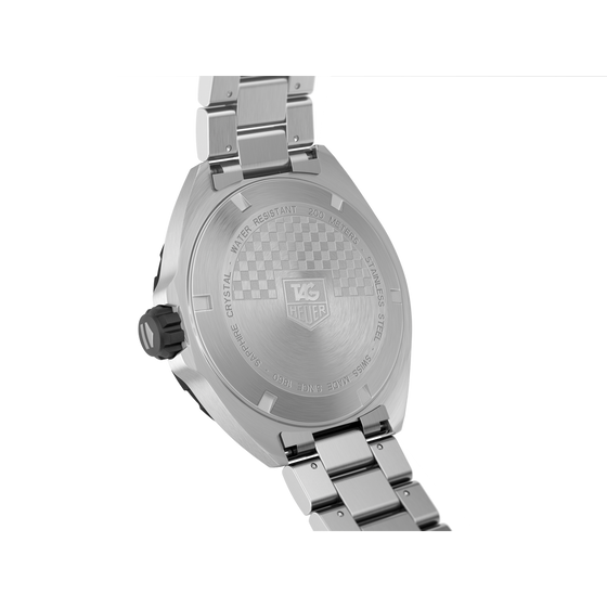 A black watch with a unique dial design and true motor-racing spirit. The 41mm brushed steel case is matched with a steel black PVD unidirectional turning bezel and a brushed steel bracelet. Sporty, shock-resistant, water resistant to 200 meters.