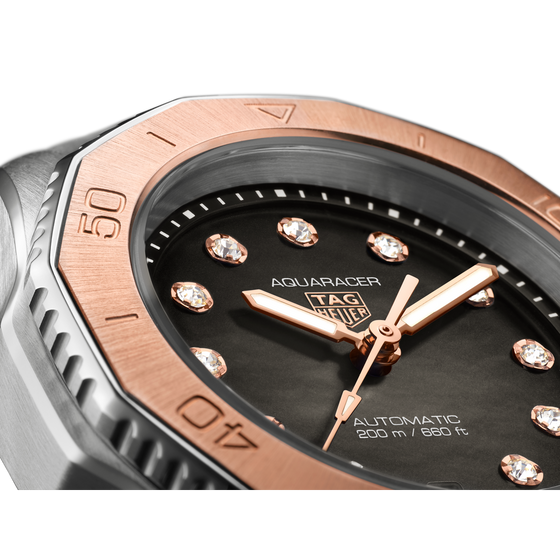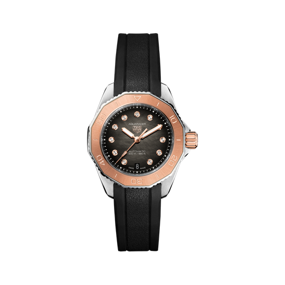 Elegance shines through every detail of this superior TAG Heuer Aquaracer, where 18K 5N solid rose gold and shimmering VS 1.4mm-diametre diamonds (0.107 ct) have pride of place. With its smoky-black dial and matching resilient rubber strap, it is set to go further than ever.